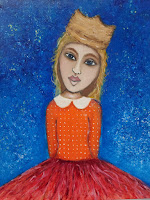 Never having painted in oil paints, always acrylics or watercolor, it was a unique experience for me. We were to paint a person and include elements of their personality. I chose to paint myself as a child. I included a fluffy tutu skirt, a polka-dotted shirt with a rounded collar, and a beautiful golden crown atop my head. We grew up poor and I never had things like ballet lessons or princess costumes so I had to make my own out of things I found around the house. For example, I made angel wings out of toilet paper and flew through the sky on my wings. I had an inner princess who wanted all of those things. I had to learn to live with my homemade versions. My influences were Yoshi Tomo Nara, a Japanese artist, because of his flat, stylized figures, and Melissa Haslam, an Australian artist, because of her beautiful, ethereal figures and fairytale-like scenes. I originally learned to paint this style from English Mixed Media painter Tamara LaPorte. I chose a warm color palette for the figure against a cool blue background to make her stand out. She is in a shy pose because her hands are hiding behind her skirt. She is curious because her head is slightly tilted. She is placed front and center in the picture frame because she is the most important element in this piece. Here, you can see my progress from end to beginning. The difference between acrylics and oils is that I tend to over-blend with oils because, I think, that is why people like oils so much. But I like to layer and you have to let it set for a little while before you can add more color. In the end, it is what it is. I like her. She is me.